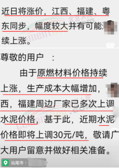 廣東汕尾區(qū)域某水泥銷售企業(yè)通知,近日水泥價(jià)格將上漲,江西、福建、粵東區(qū)域剛同步調(diào)漲,且幅度較大,并有可能繼續(xù)上漲。
