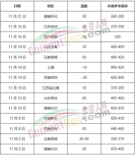據(jù)水泥人網(wǎng)近期報(bào)道,經(jīng)歷了前三季度量價(jià)齊跌后,進(jìn)入11月以來,重慶、四川、河南、江蘇等20多個(gè)省份水泥價(jià)格上調(diào)10~80元/噸。云南昆明區(qū)域近期連續(xù)多次上調(diào)水泥價(jià)格,累計(jì)漲超120元/噸。