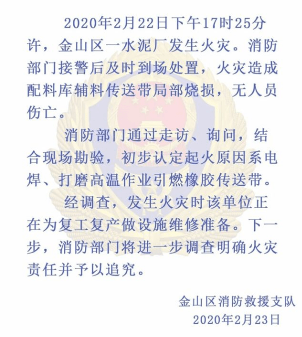 2020年2月22日下午5點(diǎn)25分許,上海金山區(qū)一水泥廠發(fā)生火災(zāi)。消防部門接警后及時(shí)到場處置,火災(zāi)造成配料庫輔料傳送帶局部燒損,無人員傷亡。消防部門通過走訪、詢問,結(jié)合現(xiàn)場勘驗(yàn),初步認(rèn)定起火原因系電焊、打磨高溫作業(yè)引燃橡膠傳送帶。