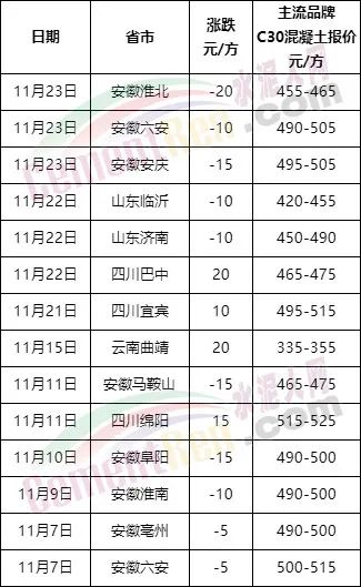 如云南曲靖市場,主要品牌混凝土價格在11月15日通知上調20元/噸,市場報價335-355元/方,仍處于較低位。陜西市場,11月22日混凝土均價454元/方,年同比下跌53元/方,跌幅達到10.52%,較上周下跌2元/方,環(huán)比下跌0.78%,整體市場報價偏弱運行。