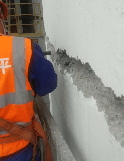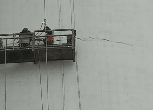 圖:混凝土水泥庫出現(xiàn)裂縫,導致水泥受潮板結(jié)嚴重,工人正在修復。