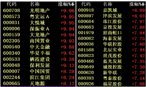 房地產(chǎn)板塊掀起“漲停潮”,中交地產(chǎn)、中國(guó)武夷4連板,天房發(fā)展、渝開(kāi)發(fā)、臥龍地產(chǎn)、空港股份、城建發(fā)展、光大嘉寶、中華企業(yè)、京能置業(yè)、沙河股份、世榮兆業(yè)、陽(yáng)光股份、信達(dá)地產(chǎn)、光明地產(chǎn)、深振業(yè)A、大龍地產(chǎn)、南國(guó)置業(yè)競(jìng)價(jià)漲停。港股方面,多只內(nèi)房股盤(pán)中漲超20%。