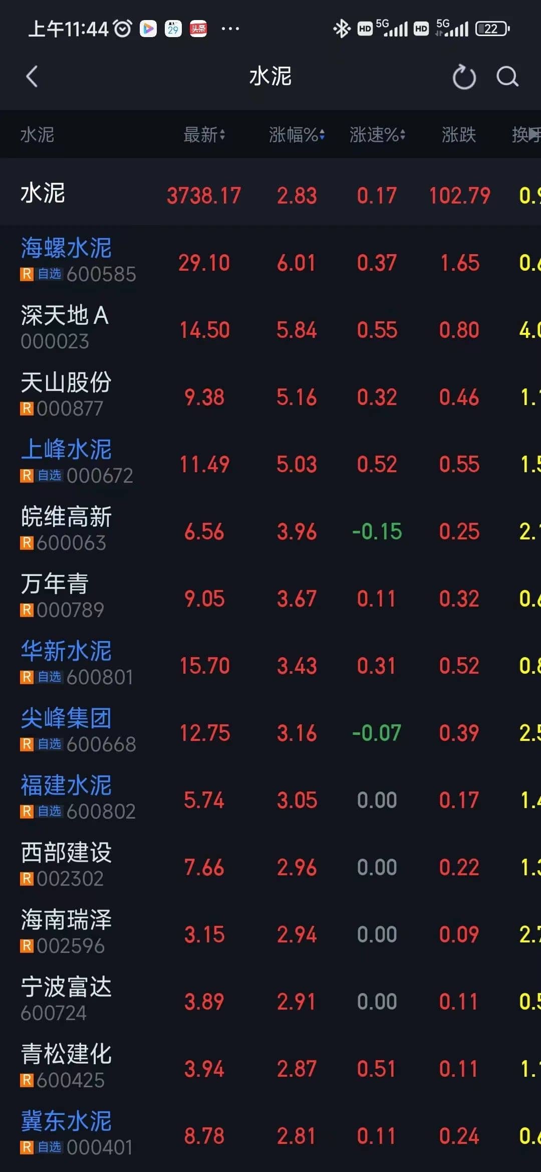 同時(shí),水泥股早盤(pán)集體上漲,中國(guó)建材(03323)漲3.62%,報(bào)6.59港元;海螺水泥(00914)漲3.02%,報(bào)27.25港元;華新水泥(06655)漲2.84%,報(bào)7.96港元;華潤(rùn)水泥控股(01313)漲2.56%,報(bào)4.01港元。A股水泥板塊也集體飄紅。