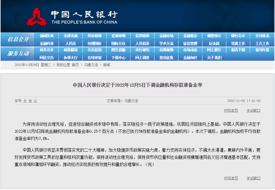 在國(guó)務(wù)院常務(wù)會(huì)議“預(yù)告”降準(zhǔn)后,中國(guó)人民銀行隨即表示將于2022年12月5日降低金融機(jī)構(gòu)存款準(zhǔn)備金率0.25個(gè)百分點(diǎn)(不含已執(zhí)行5%存款準(zhǔn)備金率的金融機(jī)構(gòu))。本次下調(diào)后,金融機(jī)構(gòu)加權(quán)平均存款準(zhǔn)備金率約為7.8%。中國(guó)人民銀行有關(guān)負(fù)責(zé)人介紹稱(chēng),此次降準(zhǔn)共計(jì)釋放長(zhǎng)期資金約5000億元,降低金融機(jī)構(gòu)資金成本每年約56億元。