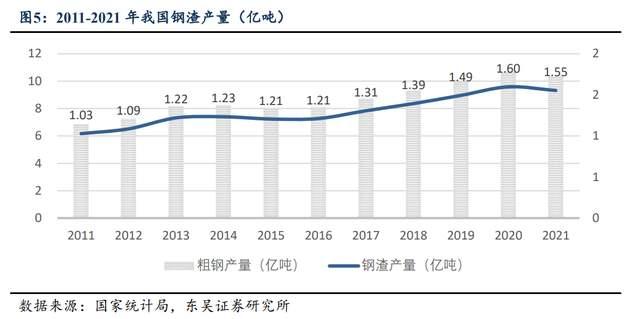 鋼渣資源化利用率僅約35%,鼓勵(lì)鋼渣等含鈣資源在水泥中的應(yīng)用。鋼渣是鋼鐵工業(yè)煉鋼過(guò)程中產(chǎn)生的大宗固體伴生物,約占鋼產(chǎn)量的 12%-15%,我們按照15%含量計(jì)算,則2021年我國(guó)鋼渣產(chǎn)量達(dá)1.55億噸。