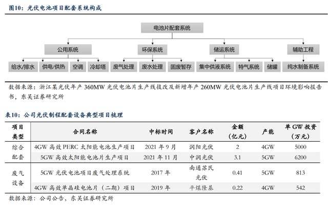 公司于2021年9月和11月接連落地兩個(gè)光伏電池綜合配套系統(tǒng)的大單,其單GW價(jià)值量分別達(dá)到5000萬(wàn)元及6200萬(wàn)元。兩個(gè)大單的落地驗(yàn)證了公司向一體化綜合配套設(shè)備模式轉(zhuǎn)變的能力,從公司典型項(xiàng)目合同金額來(lái)看,單一的廢氣設(shè)備單GW投資金額約500~800萬(wàn)元,綜合配套設(shè)備系統(tǒng)單GW投資金額約5000~6000萬(wàn)元,則公司在從廢氣設(shè)備向一體化配套設(shè)備轉(zhuǎn)型過(guò)程中單位價(jià)值體量提升空間可達(dá)5~11倍。