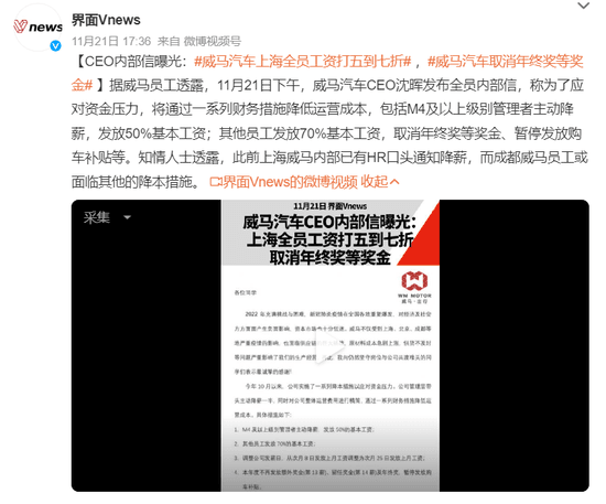 11月21日威馬汽車內(nèi)部信中提到威馬汽車上海員工工資打五至七折。為了應(yīng)對(duì)資金壓力,公司管理層帶頭主動(dòng)降薪一半,其他員工發(fā)放70%的基本工資,取消年終獎(jiǎng)等獎(jiǎng)金、暫停發(fā)放購車補(bǔ)貼等。同時(shí)對(duì)公司整體運(yùn)營費(fèi)用進(jìn)行精簡,將通過一系列財(cái)務(wù)措施降低運(yùn)營成本。據(jù)知情人士透露,成都威馬員工或面臨其他降本措施。
