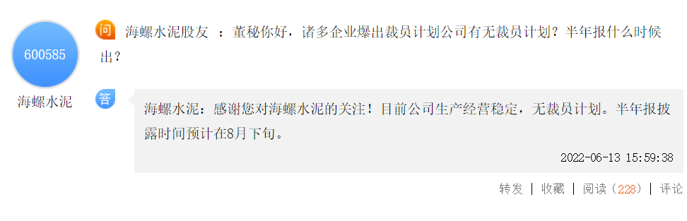 有水泥企業(yè)員工表示,原本7000-8000元的月薪如今到手只有3000-4000元,少了近一半。這是意味著各大水泥廠以另一種方式實(shí)行了“軟裁員”,實(shí)際員工數(shù)量沒有較少,而實(shí)際發(fā)放工資大量減少,以降低企業(yè)運(yùn)營成本。對(duì)于網(wǎng)傳“海螺裁員”的消息,上市公司已辟謠并稱“公司生產(chǎn)穩(wěn)定,無裁員計(jì)劃”。