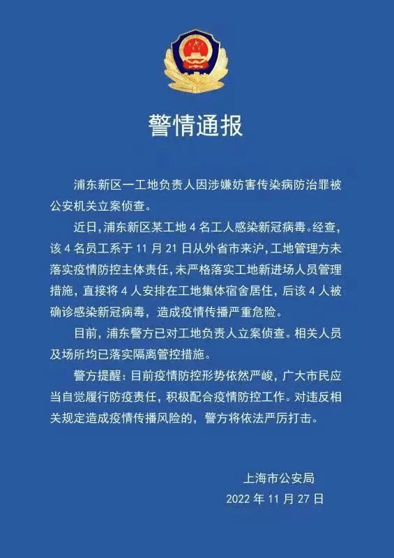 據(jù)上海市公安局通報(bào),近日,浦東新區(qū)某工地4名工人感染新冠病毒。相關(guān)工地負(fù)責(zé)人因涉嫌妨害傳染病防治罪被公安機(jī)關(guān)立案?jìng)刹椤?/p>