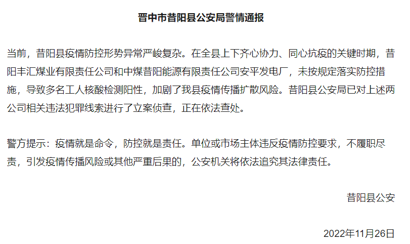11月26昔陽縣公安局通報(bào),昔陽豐匯煤業(yè)有限責(zé)任公司和中煤昔陽能源有限責(zé)任公司安平發(fā)電廠,未按規(guī)定落實(shí)防控措施,導(dǎo)致多名工人核酸檢測(cè)陽性,加劇了當(dāng)?shù)匾咔閭鞑U(kuò)散風(fēng)險(xiǎn)。昔陽縣公安局已對(duì)上述兩公司相關(guān)違法犯罪線索進(jìn)行了立案?jìng)刹椤?/p>