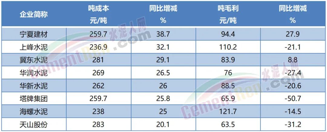 上半年煤、電成本持續(xù)高位導(dǎo)致水泥企業(yè)成本大幅上漲。上市公司噸成本數(shù)據(jù)中寧夏建材噸成本同比增加38.7%。