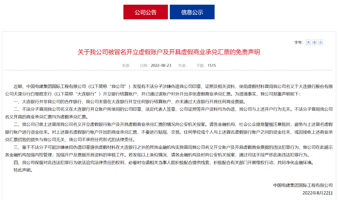 今年10月中國(guó)電建集團(tuán)國(guó)際工程有限公司發(fā)布《關(guān)于我公司被冒名開(kāi)立虛假賬戶(hù)及開(kāi)具虛假商業(yè)承兌匯票的免責(zé)聲明》稱(chēng):發(fā)現(xiàn)有不法分子涉嫌偽造公司印章、證照及相關(guān)資料,使用虛假材料冒用公司名義于銀行開(kāi)立結(jié)算賬戶(hù),并已通過(guò)該賬戶(hù)對(duì)外開(kāi)出多張?zhí)摷偕虡I(yè)承兌匯票。