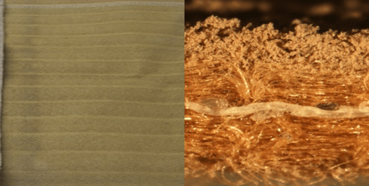 圖3 :不規(guī)則的多葉形P84®纖維與圓形纖維捕捉粉塵效果比較