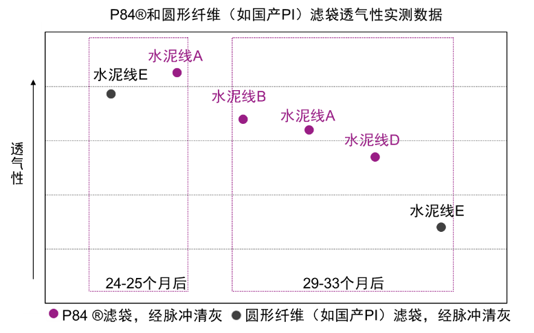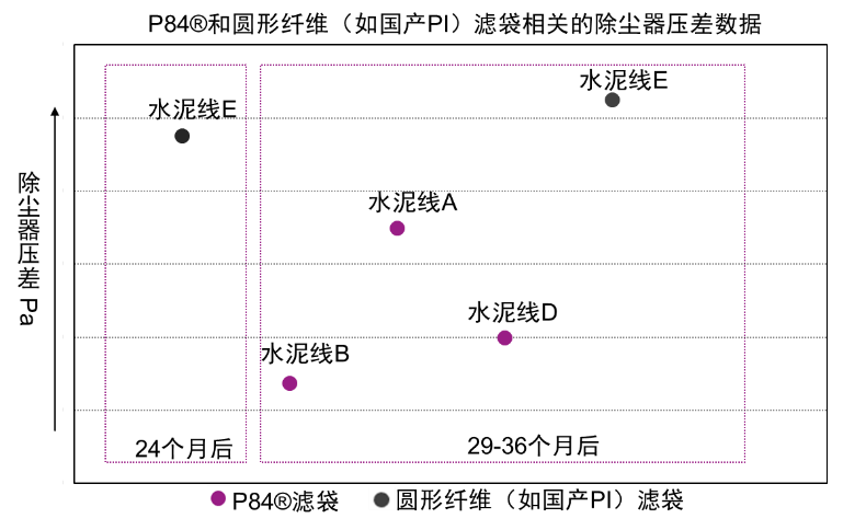 贏創(chuàng)集團(tuán)的P84®纖維團(tuán)隊(duì)基于多年走訪水泥廠收集的運(yùn)行案例,發(fā)現(xiàn)在水泥窯尾煙氣除塵的應(yīng)用中,比起行業(yè)內(nèi)其他濾袋,P84®濾袋的優(yōu)勢可以概括為以下三個(gè)方面: