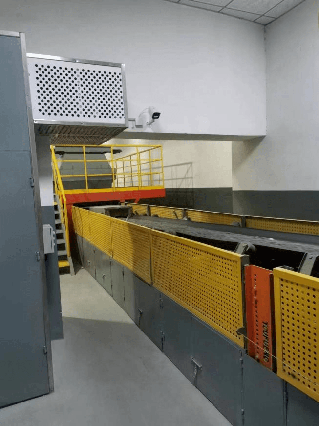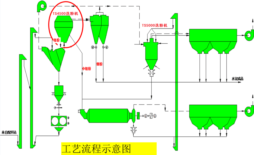 蘇州天山水泥生產(chǎn)工藝流程配置為4.2*13M管磨機+180*120輥壓機+TS4500雙轉(zhuǎn)籠選粉機,首先將各原材料按照一定配比通過電子皮帶秤計量混合后送至配料提升機,除鐵后進入循環(huán)提升機,提升至V型選粉機進行選粉,粗顆?;睾阒貍}緩沖后進入輥壓機中碾壓,碾壓擠碎后通過循環(huán)提升機帶至V型選粉機,V型選粉機粗選出的較細(xì)物料進入TS4500選粉下轉(zhuǎn)籠初選,200um以上的顆粒通過下轉(zhuǎn)籠選粉后回恒重倉,小于200um的顆粒進入TS4500選粉機上轉(zhuǎn)籠再次進行選粉,合格品通過旋風(fēng)筒收集送入成品斜槽與磨機成品進行混合,不合格品進入球磨機進行粉磨,球磨機粉磨后的物料通過出磨提升機提升至TS5000選粉機選粉,合格品通過系統(tǒng)風(fēng)機帶入收塵系統(tǒng)收集后進入成品斜槽與TS4500成品混合,最終送入水泥庫作為水泥成品儲存,不合格品回球磨機進行再次粉磨。