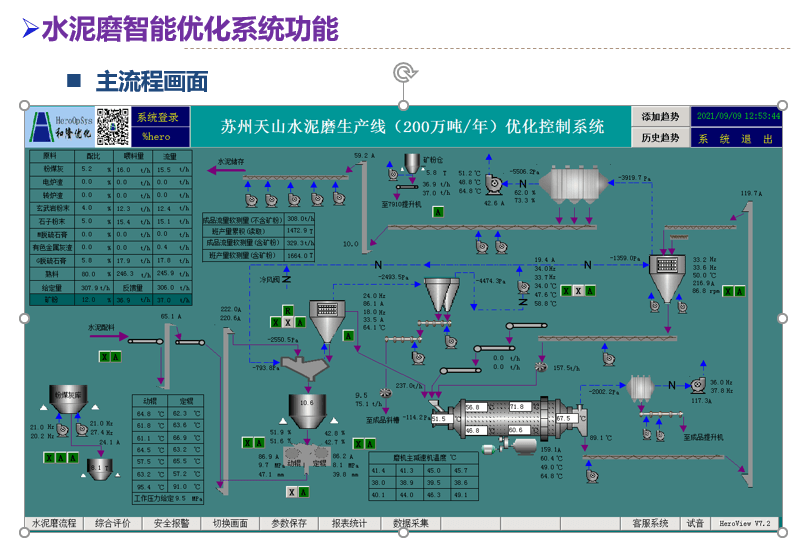 3.創(chuàng)造性地在水泥生產(chǎn)過程中采用了“自尋優(yōu)”算法,結(jié)合機理模型、數(shù)據(jù)模型和專家經(jīng)驗三者進行變步長、變周期尋優(yōu),使系統(tǒng)始終運行在最佳工況,控制主界面如下圖: