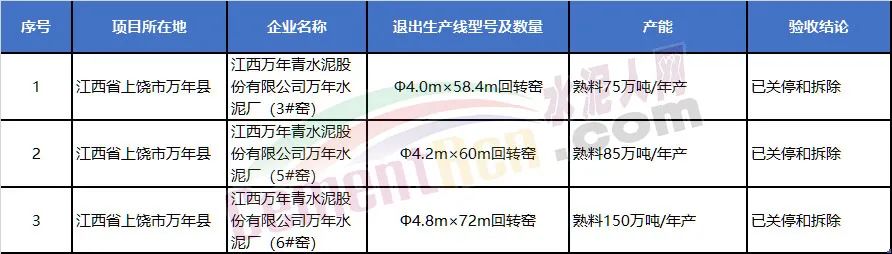 1月19日江西省工信廳公告:用于江西萬年青水泥股份有限公司萬年水泥廠2×5100t/d水泥熟料生產(chǎn)線產(chǎn)能置換的3#窯、5#窯、6#窯(共計(jì)水泥熟料產(chǎn)能310萬噸)關(guān)停和拆除。