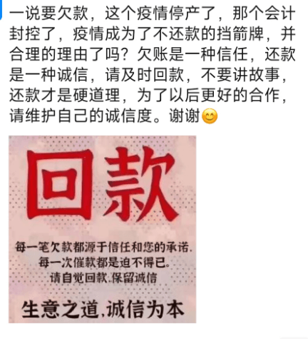 有網(wǎng)友表示,疫情成了不還款的擋箭牌。一說(shuō)要欠款就說(shuō)停產(chǎn)了,會(huì)計(jì)封控了。疫情是暫時(shí)的,信譽(yù)是長(zhǎng)久的,大家都在疫情中,都很艱難。