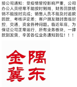 金隅冀東某公司因公司通知,受疫情影響,辦公室人員經(jīng)常不能按時(shí)到崗,財(cái)務(wù)回款核銷不能按照完成,銷售人員不能及時(shí)追款回款,考核評(píng)定差,客戶朋友又隨時(shí)面臨封控,交通,資金各種問(wèn)題,臨近年底,為保證公司正常運(yùn)行,所有業(yè)務(wù)板塊一律款到發(fā)貨。