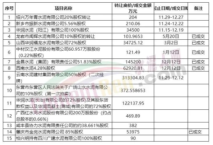 華潤水泥、萬年青水泥、中材水泥等水泥集團企業(yè)部分股權公開交易