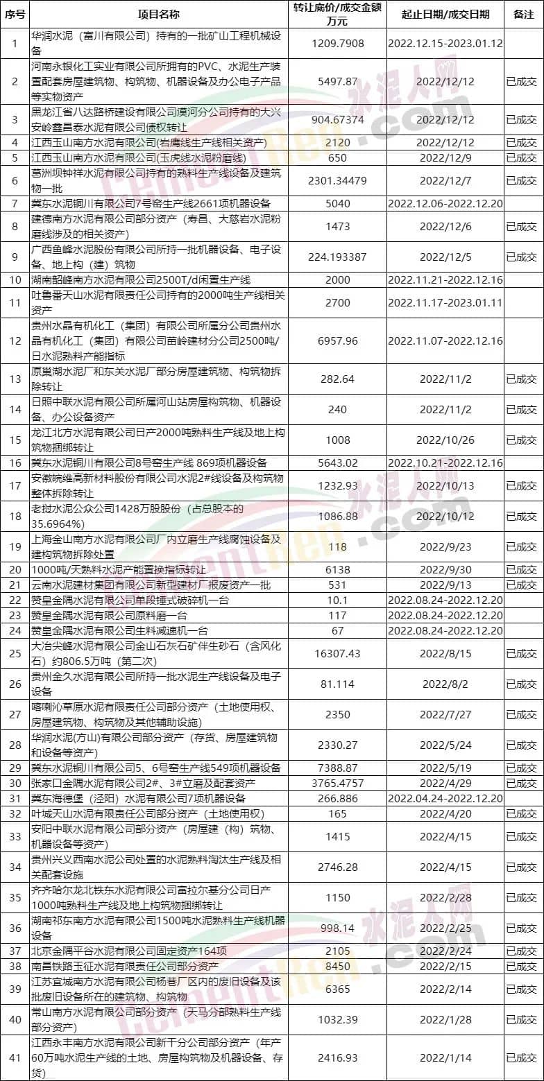 除上述水泥企業(yè)股權公開交易外,更多企業(yè)為清退無效、低效資產在產權交易平臺公開出售旗下設備、土地、礦山以及產能指標等。涉及企業(yè)不僅包括中國建材集團旗下水泥企業(yè)也包含金隅冀東、華潤、葛洲壩、尖峰、魚峰等行業(yè)龍頭企業(yè),涉及金額超10.69億。