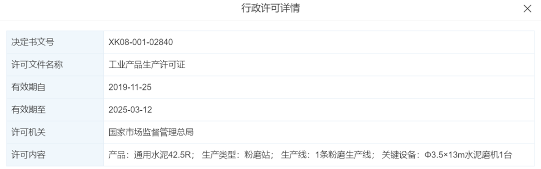 山東江河水泥有限公司生產(chǎn)許可證編號(魯)XK08-001-05307,有效期至2027年1月8日,企業(yè)類型為粉磨站;企業(yè)擁有1條粉磨生產(chǎn)線;關鍵設備為Φ3.2×13m水泥磨機1臺;企業(yè)“恒誠”商標已注冊。