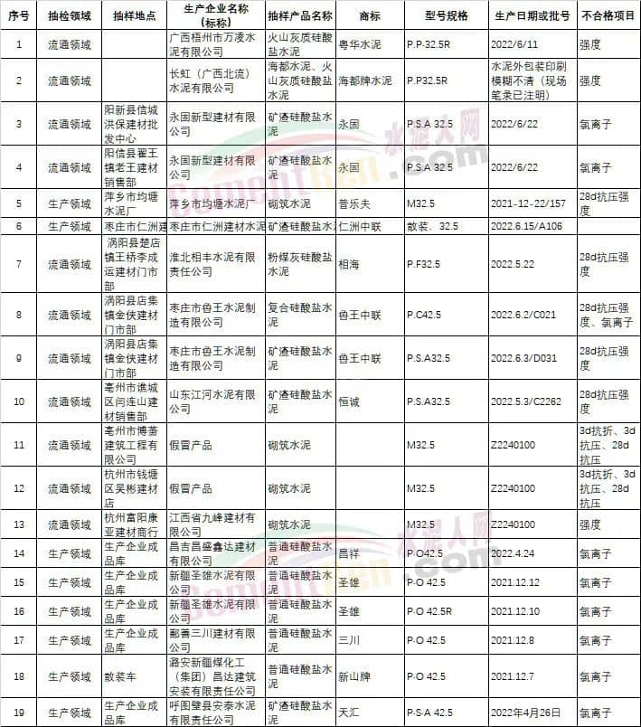 山東省濱州流通領域抽檢同一家企業(yè)兩批次水泥氯離子不合格
