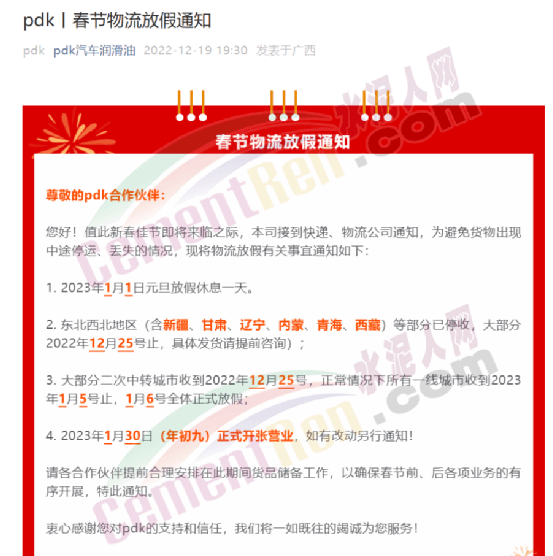 pdk汽車潤滑油春節(jié)物流放假通知稱,公司接到快遞、物流公司通知,為避免貨物出現(xiàn)中途停運(yùn)、丟失的情況,2023年1月1日元旦放假休息一天。