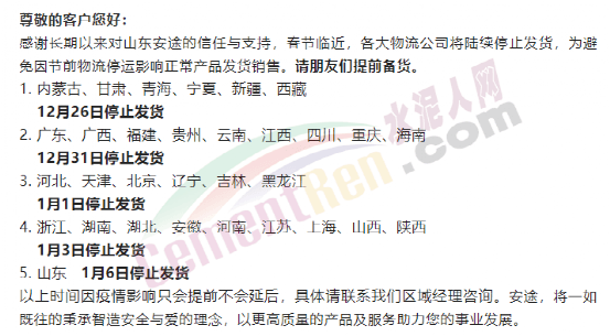 據(jù)水泥人網(wǎng)了解,目前已有多家物流公司發(fā)布春節(jié)停運(yùn)的通知。受大多物流公司停運(yùn)影響,各行各業(yè)產(chǎn)業(yè)鏈的運(yùn)行均受到一定的影響,相繼出現(xiàn)發(fā)貨困難、配套供應(yīng)緊缺及生產(chǎn)任務(wù)加重的問題。