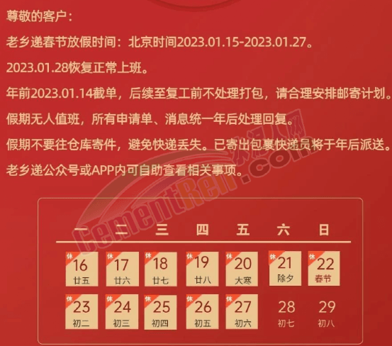 “老鄉(xiāng)遞”春節(jié)放假時(shí)間為2023年1月15日至1月27日,1月28日恢復(fù)正常上班。年前2023年1月14日截單,后續(xù)至復(fù)工前不處理打包。假期無人值班,所有申請單,消息統(tǒng)一年后處理回復(fù)。同時(shí)提示,假期不要往倉庫寄件,避免快遞丟失。已寄出包裹快遞員將于年后派送。
