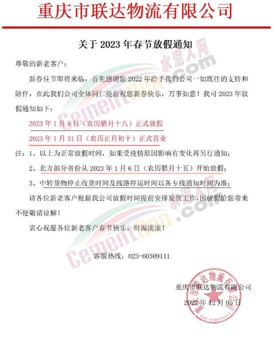 重慶市聯(lián)達(dá)物流有限公司2023年1月9日(農(nóng)歷臘月十八)正式放假,2023年1月31日(農(nóng)歷正月初十)正式營業(yè)。如果受疫情原因影響有變化再另行通知;北方部分省份從2023年1月6日(農(nóng)歷臘月十五)開始放假;中轉(zhuǎn)貨物停止收貨時(shí)間及線路停運(yùn)時(shí)間以各專線通知時(shí)間為準(zhǔn)。