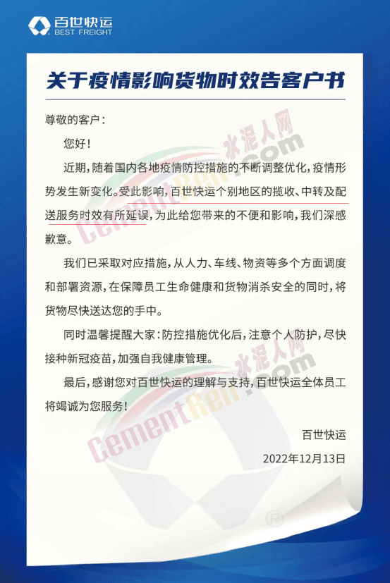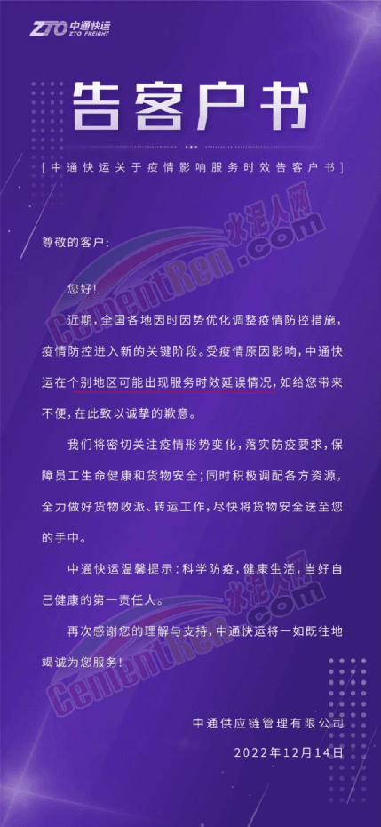 中通快運(yùn)關(guān)于疫情影響服務(wù)時(shí)效告客戶書稱:近期,全國各地因時(shí)因勢優(yōu)化調(diào)整疫情防控措施,疫情防控進(jìn)入新的關(guān)鍵階段。受疫情原因影響,中通快運(yùn)在個(gè)別地區(qū)可能出現(xiàn)服務(wù)時(shí)效延誤情況,如給您帶來不便,在此致以誠摯的歉意。將密切關(guān)注疫情形勢變化,落實(shí)防疫要求,保障員工生命健康和貨物安全;同時(shí)積極調(diào)配各方資源,全力做好貨物收派、轉(zhuǎn)運(yùn)工作,盡快將貨物安全送至您的手中。