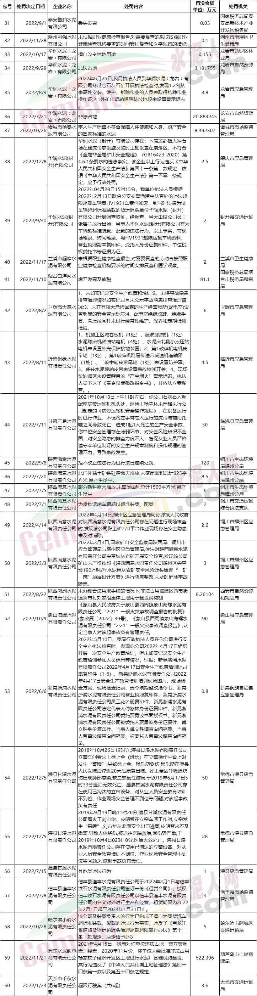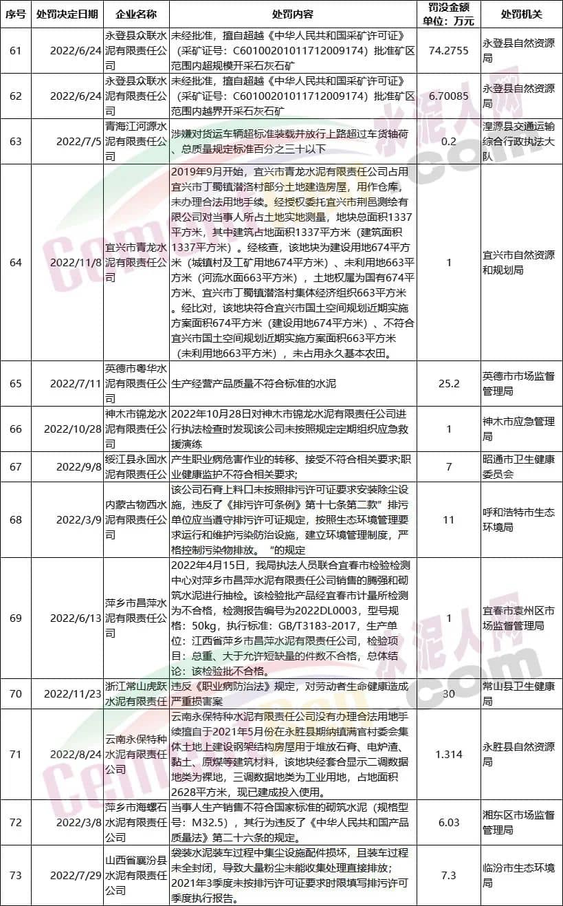 另外,7月15日因違反《工貿(mào)企業(yè)有限空間作業(yè)安全管理與監(jiān)督暫行規(guī)定》澧縣甘溪水泥有限責任公司被常德市澧縣應急管理局罰款1萬元,2022年合計被處以79萬元罰款。