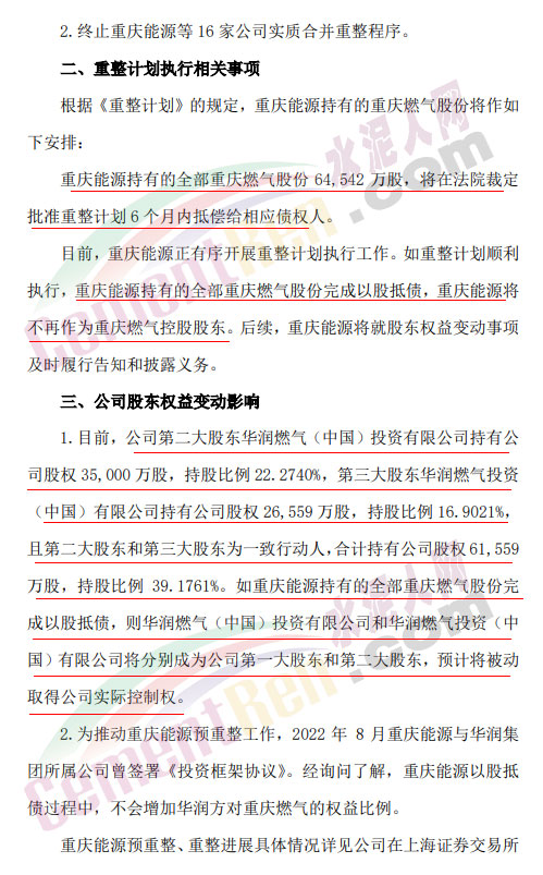 近日,重慶燃?xì)獍l(fā)布公告稱,重慶五中院裁定批準(zhǔn)公司控股股東重慶能源等16家公司實(shí)質(zhì)合并重整計(jì)劃,終止重慶能源重整程序。重慶能源持有的公司股份6.45億股,將在法院裁定批準(zhǔn)重整計(jì)劃6個(gè)月內(nèi)抵償給相應(yīng)債權(quán)人。