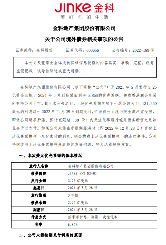 12月28日,金科股份公告稱,一筆金額約1113.125萬(wàn)美元的利息應(yīng)于 2022年11月28日到期兌付,但當(dāng)前公司境內(nèi)現(xiàn)金流嚴(yán)重受限,即使公司竭盡所能,預(yù)計(jì)寬限期30天內(nèi)無(wú)法取得履行境外債務(wù)所需之足夠現(xiàn)金予以支付。