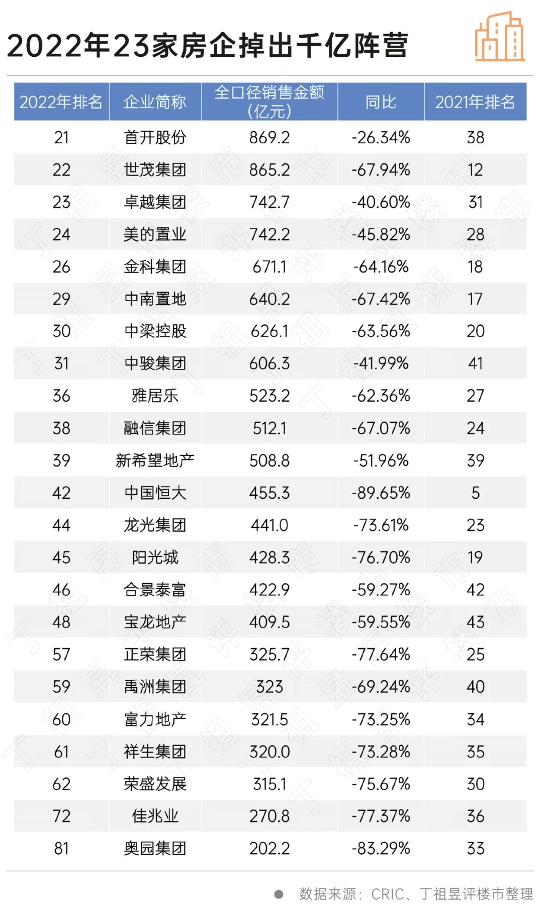 據(jù)水泥人網(wǎng)了解,2022年,多數(shù)規(guī)模房企深陷負(fù)增長(zhǎng)困局,百?gòu)?qiáng)房企全年業(yè)績(jī)有九成下滑。2022年成為房企洗牌年,最明顯的標(biāo)志是,千億房企數(shù)量銳減一半。