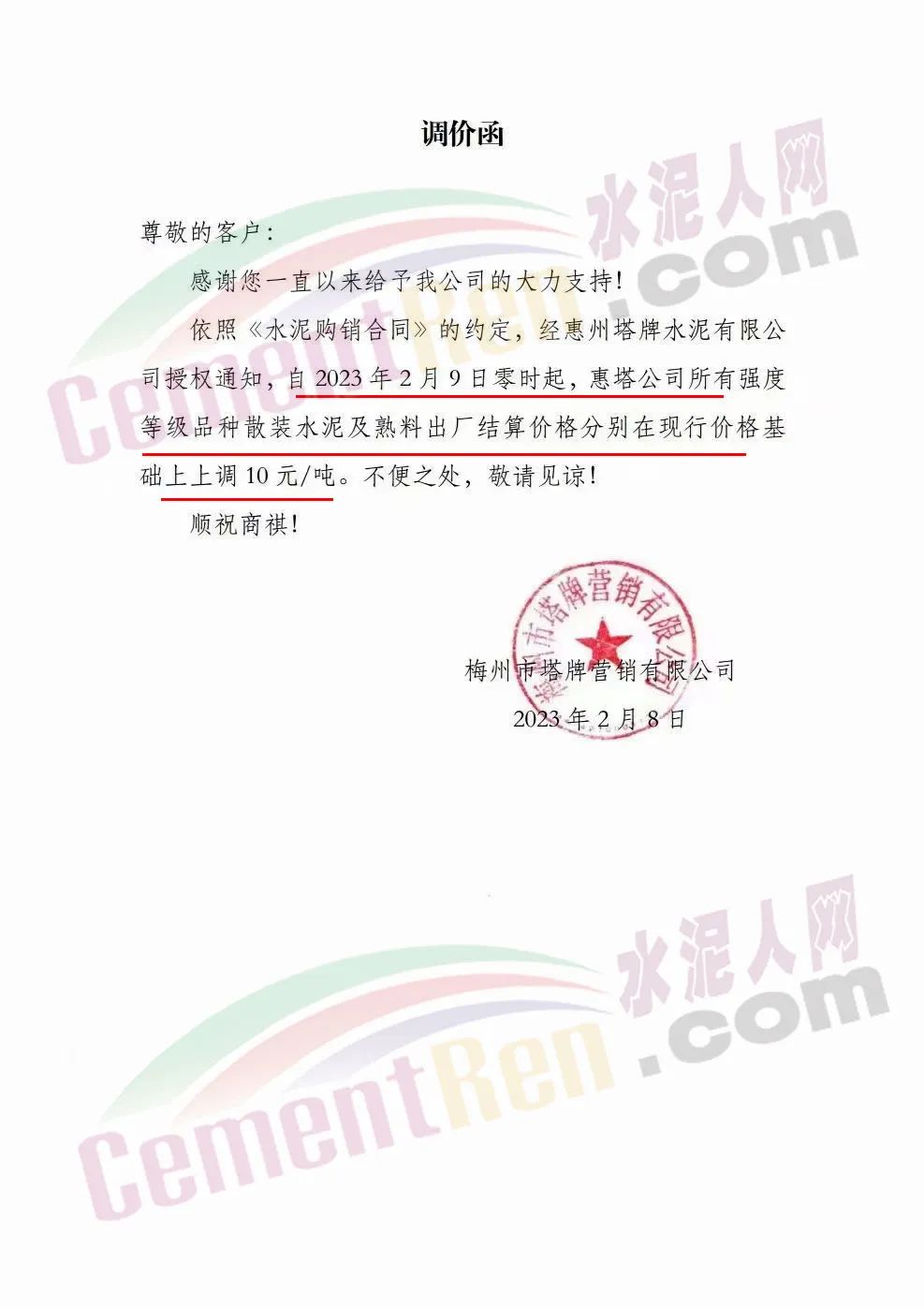 梅州塔牌營(yíng)銷(xiāo)有限公司通知,自2月9日零時(shí)起,惠塔公司所有強(qiáng)度等級(jí)品種散裝水泥及熟料出廠結(jié)算價(jià)格上調(diào)10元/噸。