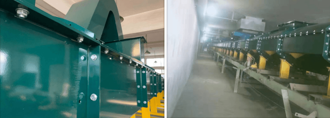 其結(jié)構(gòu)特點除下料口處理(導(dǎo)流槽),檢修孔,回程清灰三種結(jié)構(gòu),與精密微動力導(dǎo)料槽相同外,還有針對性地在各法蘭間使用密封條進行密封,防溢裙邊磨損時,依靠橡膠彈力,自動跟蹤皮帶進行密封。