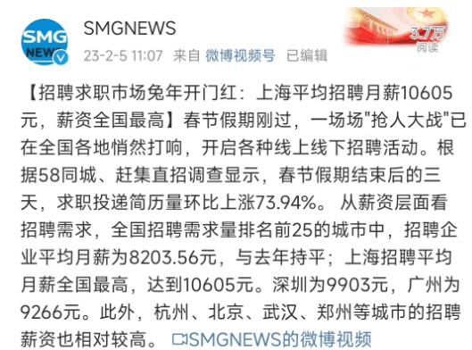 日前,上海廣播電視臺(tái)融媒體中心微博號(hào)發(fā)布消息稱:春節(jié)假期剛過,一場場“搶人大戰(zhàn)”已在全國各地悄然打響,開啟各種線上線下招聘活動(dòng)。根據(jù)58同城、趕集直招調(diào)查顯示,春節(jié)假期結(jié)束后的三天,求職投遞簡歷量環(huán)比上漲73.94%。