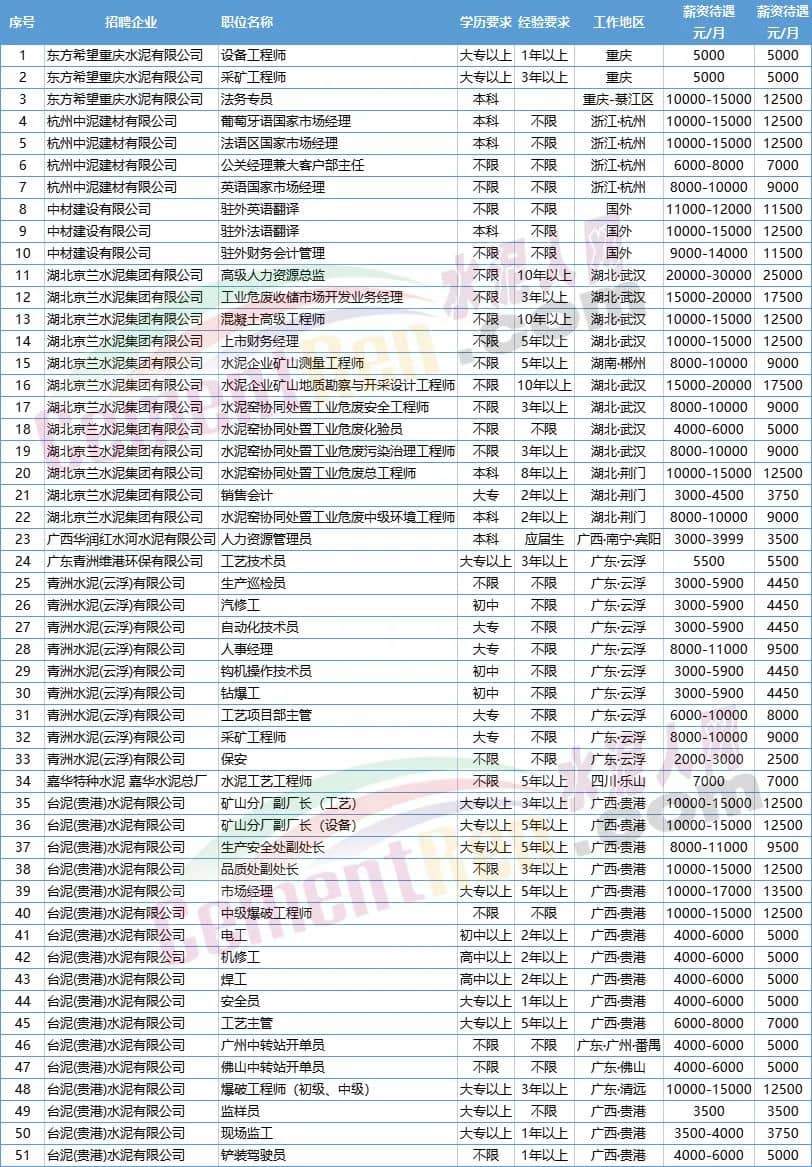 綜合近期發(fā)布招聘信息51條招聘信息可見,月薪最高的是湖北京蘭水泥集團(tuán)有限公司招聘職位是高級(jí)人力資源總監(jiān),要求有10年以上經(jīng)驗(yàn),月薪20000-30000元;最低為青洲水泥(云浮)有限公司招聘保安員,月薪2000-3000元;51條招聘信息平均薪資在8691.18元/月;月薪在8000元以下的22條,8000元以上的信息29條。