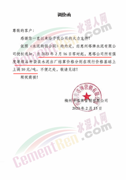 塔牌水泥通知,2月16日零時起,惠塔公司水泥價格上調(diào)10元/噸。