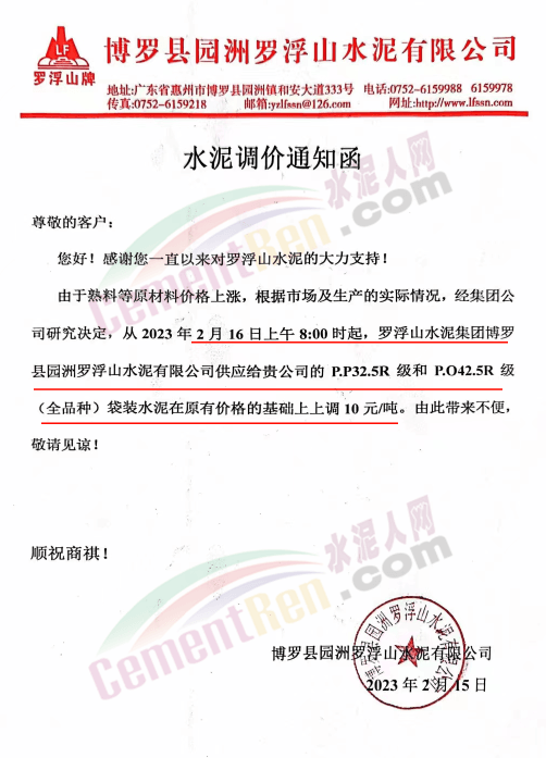 博羅縣園洲羅浮山水泥、羅浮山水泥惠州市寶湖建材通知,2月16日8時起,水泥價格上調(diào)10元/噸。