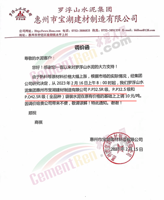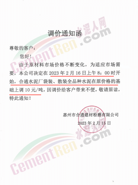 惠州市合通建材粉磨有限公司通知2月16日上午8時起,水泥價格上調(diào)10元/噸。