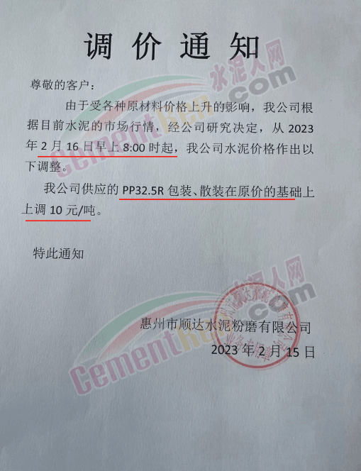 惠州順達(dá)水泥粉磨公司通知2月16日8時起PP32.5R水泥上調(diào)10元/噸。