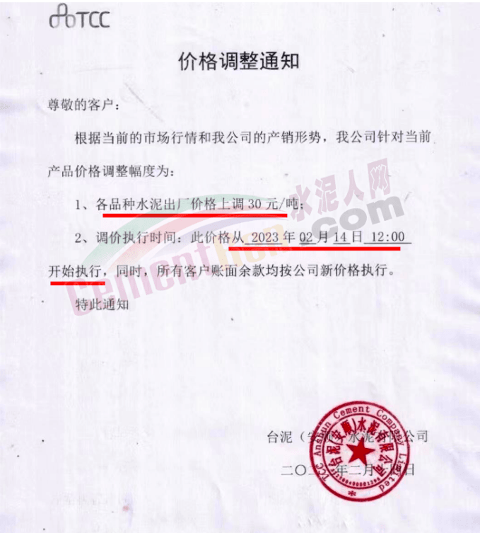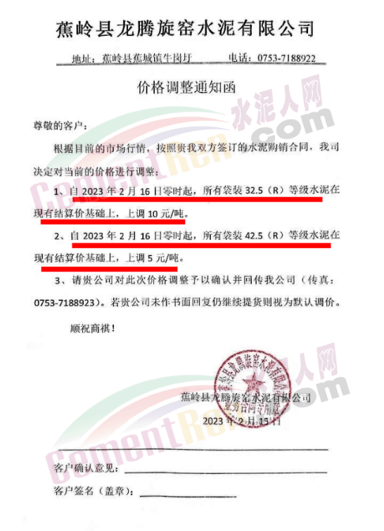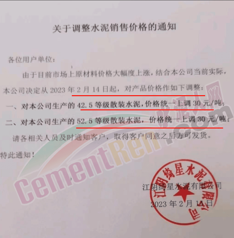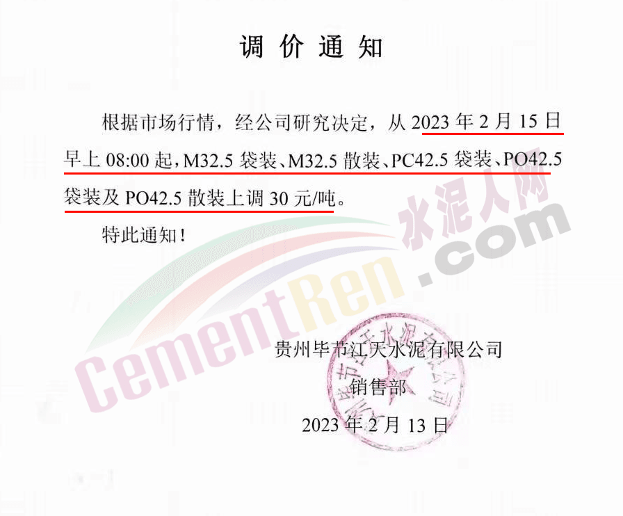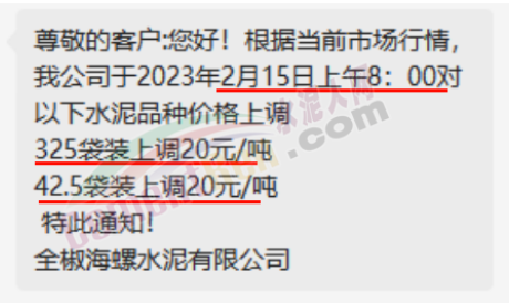 張家界南方銷售部通知,自2023年2月16日0時起,對各區(qū)域各品種水泥價格上調(diào)20元/噸。