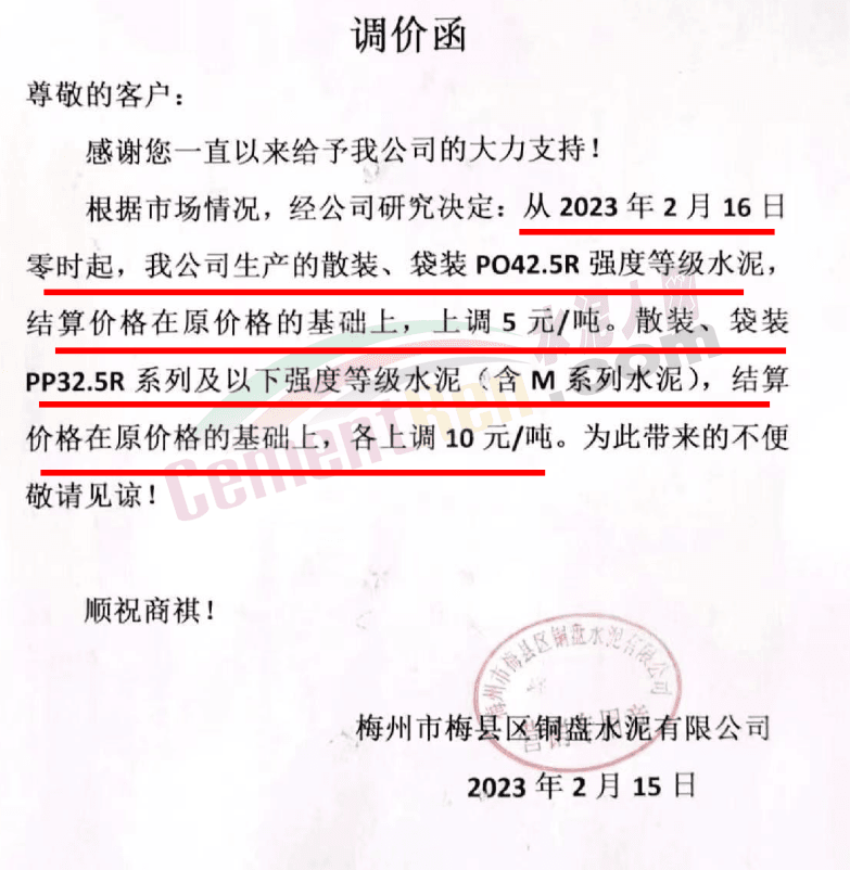梅州市梅縣區(qū)銅盤水泥有限公司通知,從2023年2月16日零時起,公司生產(chǎn)的散裝、袋裝PO425R 強(qiáng)度等級水泥,結(jié)算價格在原價格的基礎(chǔ)上,上調(diào)5元/噸。散裝、袋裝PP32.5R系列及以下強(qiáng)度等級水泥(含M系列水泥),結(jié)算價格在原價格的基礎(chǔ)上,各上調(diào)10 元/噸。