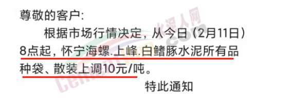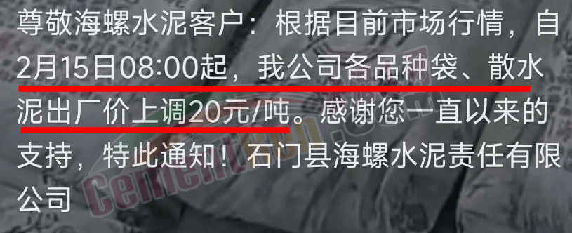 湖南石門海螺通知,自2月15日8時起,公司各品種袋、散水泥出廠價上調(diào)20元/噸。