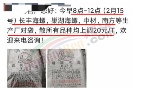 2月15日,長豐海螺、巢湖海螺、中材,南方等水泥廠對袋、散所有品種水泥上調(diào)20元/噸。