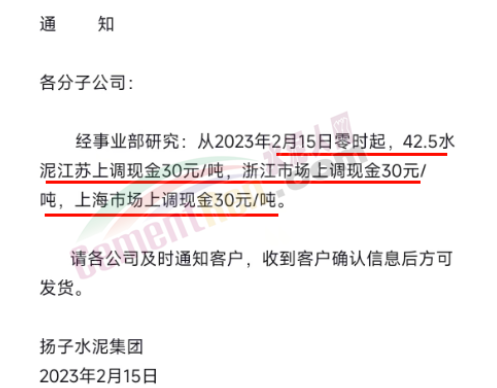 揚(yáng)子水泥集團(tuán)通知,2月15日零時起,江浙滬市場42.5水泥上調(diào)30元/噸。
