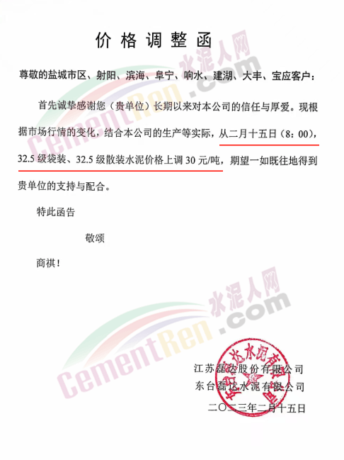 磊達(dá)水泥通知,對鹽城市區(qū)、射陽、濱海、阜寧、響水、建湖、大豐、寶應(yīng)客戶從2月15日8時起,32.5 級袋裝、32.5級散裝水泥價格上調(diào) 30元/噸。